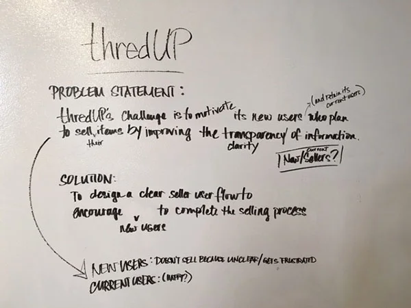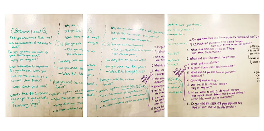 We brainstormed and came up with several initial interview questions that were focused on the business model - which we were not supposed to solve. Most of the customers we interviewed were happy with their experience with thredUP. We iterated our questions several times to get the feedback we were searching for.